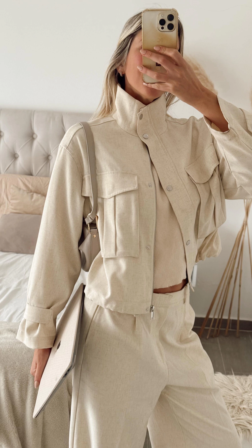 Descripción: Pantalón palazzo en tono natural (Hace juego en Set con la Cahqueta Eloísa) de calce recto, con pinzas delanteras y traseras que estilizan la figura y aportan un aire elegante. Su confección de tela liviana, suave y con caída fluida lo convierte en un básico atemporal: Para usar tanto en looks relajados de día como en conjuntos más sofisticados de noche. Bolsillos laterales.
